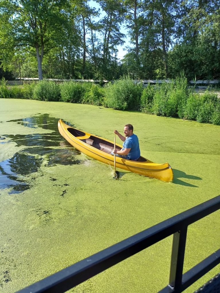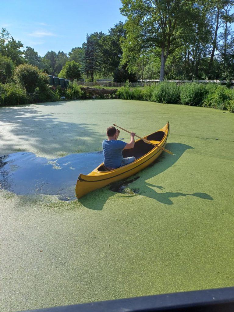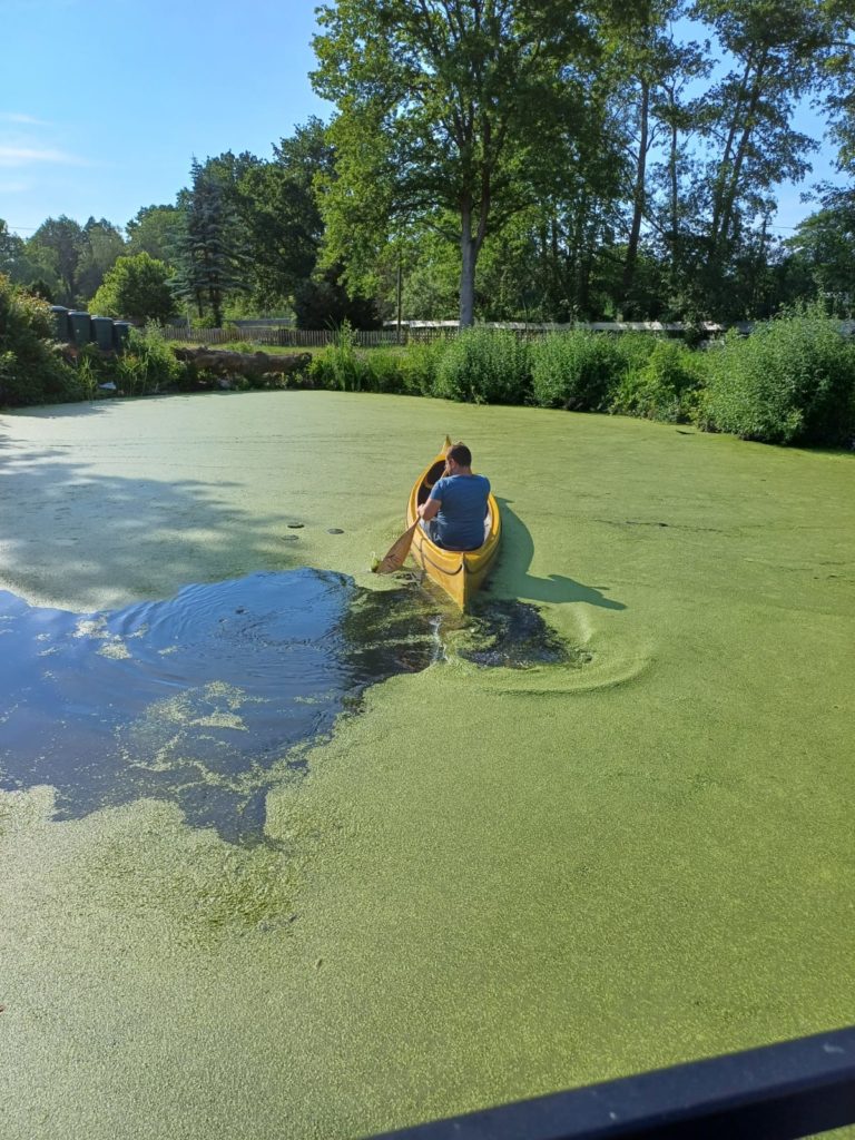 Wir versuchen den Entenflott auf 1/4 der Teichfläche zu reduzieren.